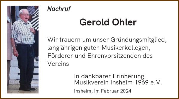 der Musikverein Insheim muss heute Abschied nehmen von seinem großen Förderer Gerold Ohler.